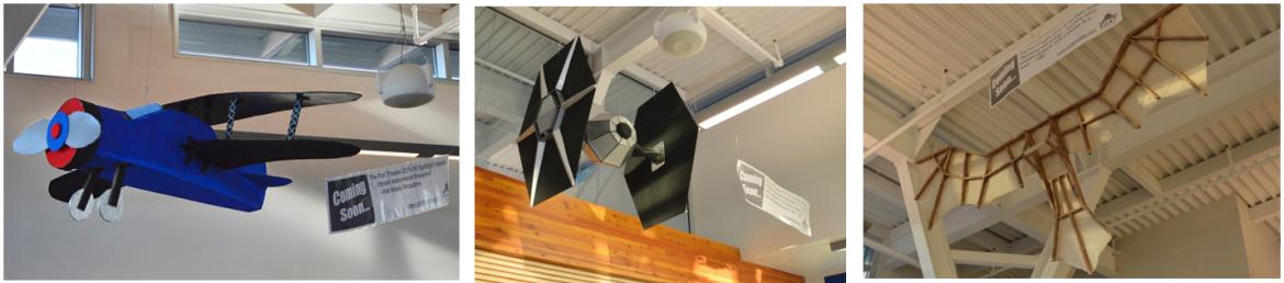 First-year VIU art students explored a “history of aviation" theme to suit the space and to allow for the use of "skywriting" style banners that offer highlights to viewers on the upcoming Port Theatre Spotlight Series. The eclectic mix of 17 sculptures represents a range and variety of interests — everything from Da Vinci flying machines to the latest surveillance drone technology.