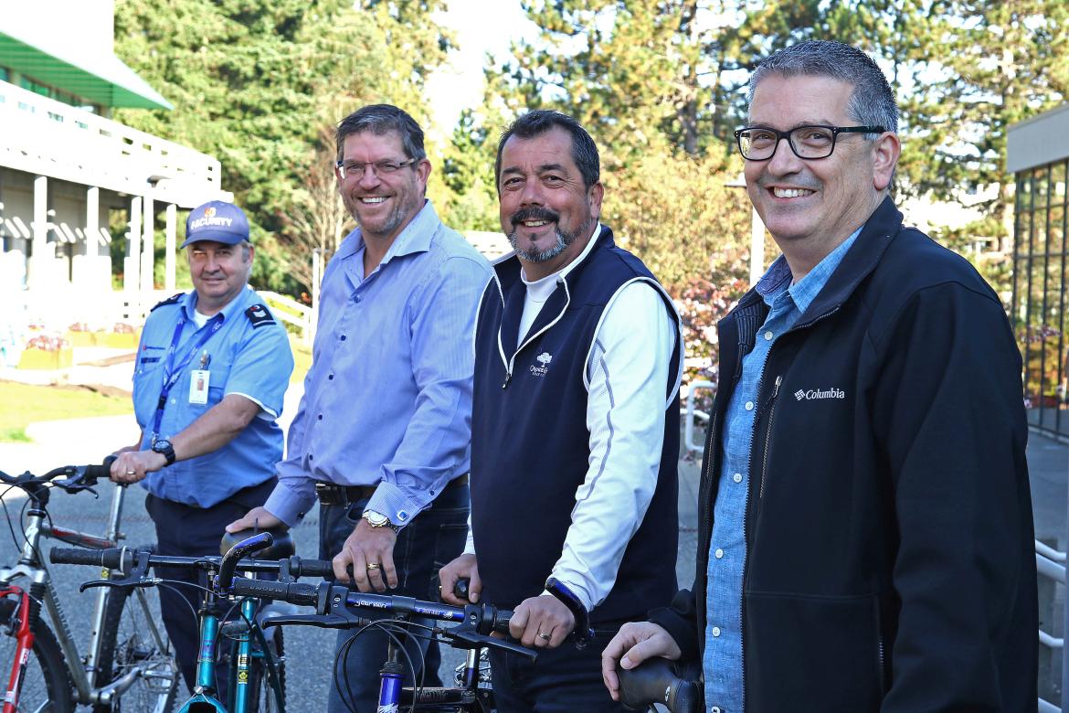Left to right: Dan Spivey, Acting Superintendent with Campus Security; Greg Nowik and Eddie Goncalves with The Nowik Team; and Mark Egan, VIU Health and Safety Advisor; show off the first round of bikes donated by Bikes for Kids.